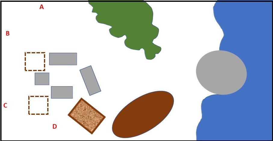 The Norman warband will enter fron a table edge (A, B, C, or D) which is specified before any other set-up takes place. They may enter on or after the first turn at any point. The Anglo-Saxon warbands will set up in and around the buildings and fields of their village, within the perimeter drawn to include all buildings and fields. The Danes will dice for each ship, with high scores placing their ships anywhere along the coastline (except on the headland) before low scores. All Danish ships are placed on the first turn. All Danes start on their ships and must move off onto land: the ships do not move during play, but wait patiently to be sailed off at the end of the game or to be burnt during it(!).