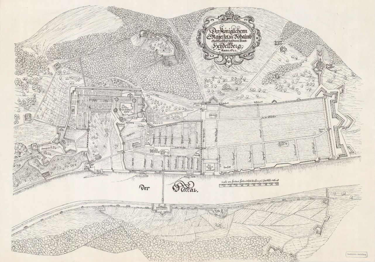 The castle and part of the fortifications in 1622. The bottom of the map is roughly north, where the Neckar River runs.