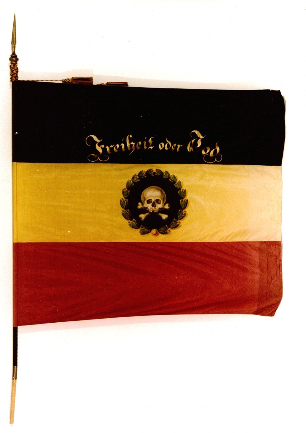 The flag of a Freiwilligen Compagnie (Volunteer Company) found in the State Museum in Trier, Germany. It reads "Freedom or Death!"