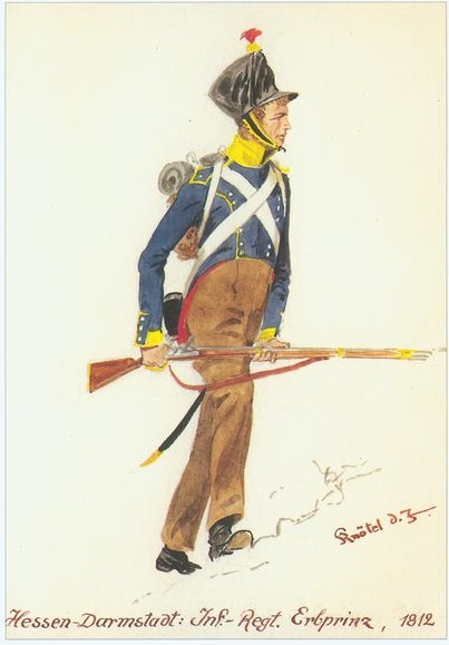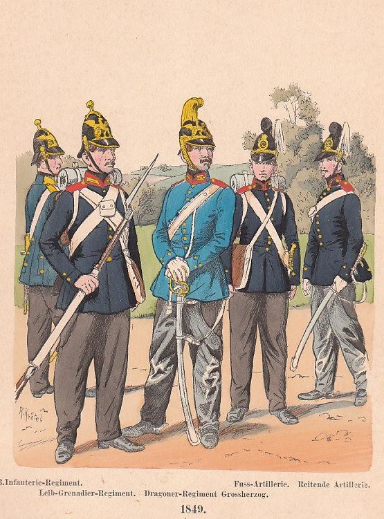![]() The Hessian infantry in Napoleonic-era uniform, which was similar to those worn in 1848 - Hesse in this case refers not to Hesse-Kassel ("the Electorate of Hesse", or "Kur-Hesse") but to the Grand Duchy of the post-Napoleonic period |