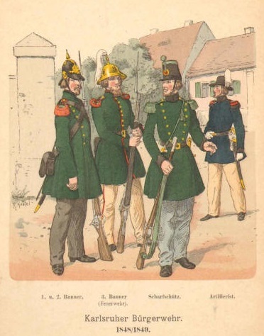 ![]() Town militia from Karlsruhe, the capital of Baden: infantryman, fireman, sharp-shooter, and artillerist |