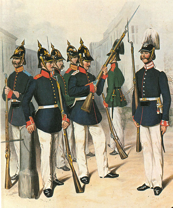 The troops of Baden, Hesse, and Prussia were all engaged at different points during the conflict. The Prussians who beseiged Rastatt were elements of a Federal force, which may well have included soldiers from other German states as well. After defeating Napoleon, there was a strong militia tradition in Germany - the Landwehr and B�rgerwehr were both forces which could not be politically dismissed, much as they caused unease among the ruling classes for what turned out to be excellent reasons: in the Baden Revolution many did in fact take up arms against their former masters. The Baden forces were in a transitional period between a Napoleonic-era uniform with coatee and the later uniform with tunic, and were staring to wear the early version of the picklehaub (the taller one most wargamers associate with Crimean Russians). In the 1st Schleswig-Holstein War, the Badenese infantry still wore coatee and shako of their Napoleonic uniforms. The artillery, however, wore a raupenhelm similar to that of the Bavarian army. The Hessian forces are always depicted wearing a Napoleonic-era uniform with shako. The militia of some states is shown in a Napoleonic-style landwehr uniform with a flat-topped cap and landwehr cross. Prussian troops looked much like they would in the more often-gamed wars of 1866 and 1870, except that trousers were worn long, not tucked into boots, and the picklehaub was in its earlier, taller form. The jager were at this period still wearing the picklehaub as well, not shifting to their distinctive shako for a few more years. The pictures below show some of the government troops during the conflict: