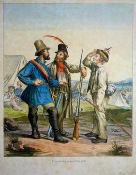 Of all the many leaders involved in the Baden Revolution, Frederich Hecker, commander during the first part of the revolution, is perhaps the most famous. (He ended up fleeing to the US, where he became a successful abolitionist politician in Illinois and served as a colonel in the American Civil War.) He became well-known for his costume, which was the uniform of many of the revolutionary troops: a high-crowned broad-brimmed grey hat (sometimes black) with a plume, and a blue-grey peasant smock, similar to those worn in red by the Garibaldini in Italy. The following pictures illustrate the ragged-but-uniform appearance of the German revolutionaries in Baden and the Palatinate.